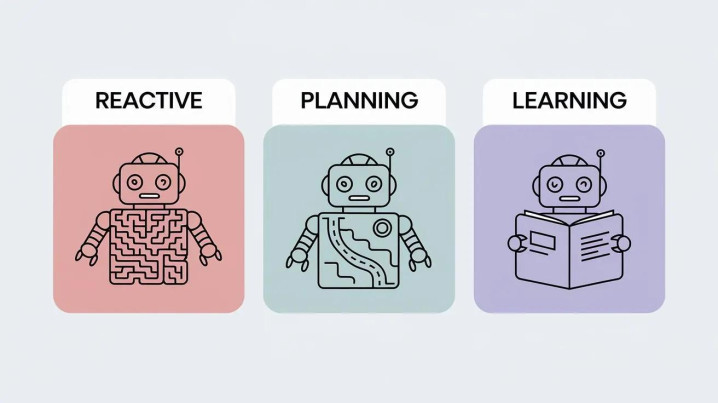 • 类比:类似人类大脑——既能反射性地将手从火中缩回(反应式),也能规划公路旅行(慎思式),还能学习新路线(学习型)。