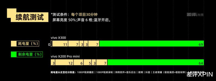 不过好在经过了三小时的轻度续航测试之后,X300 的电量还剩下 69% ,确实比 vivo X200 Pro mini 的 64% 有一定进步。